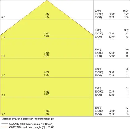 Der Abstrahlwinkel bezeichnet den Winkel, in dem das Licht aus der Lichtquelle ausgestrahlt wird. Er wird in Grad (D) angegeben. Je geringer die Gradzahl des Abstrahlwinkels ist, desto kleiner ist auch der Durchmesser des Lichtkegels, den die Lichtquelle produziert. Beispiel: Wird eine Lampe mit einem Abstrahlwinkel von 60 Grad an der Decke (2,5 m Höhe) angebracht, erzeugt sie einen Lichtkegel von 2,9 Metern Durchmesser. Hat die Lampe hingegen einen Abstrahlwinkel von 120 Grad, beträgt der Lichtkegel 8,7 Meter im Durchmesser. |