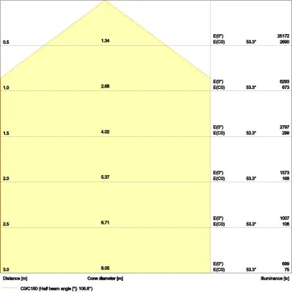Der Abstrahlwinkel bezeichnet den Winkel, in dem das Licht aus der Lichtquelle ausgestrahlt wird. Er wird in Grad (D) angegeben. Je geringer die Gradzahl des Abstrahlwinkels ist, desto kleiner ist auch der Durchmesser des Lichtkegels, den die Lichtquelle produziert. Beispiel: Wird eine Lampe mit einem Abstrahlwinkel von 60 Grad an der Decke (2,5 m Höhe) angebracht, erzeugt sie einen Lichtkegel von 2,9 Metern Durchmesser. Hat die Lampe hingegen einen Abstrahlwinkel von 120 Grad, beträgt der Lichtkegel 8,7 Meter im Durchmesser. |