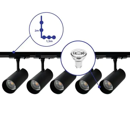 Description Bright Choice Ensemble complet Rail Monophasé Rail L 1,5 x 2 Mètre Noir | incl. 5x Spot + GU10 2700K 3W Dimmable + Embout, Connecteur d’Alimentation et L -Connecteur
