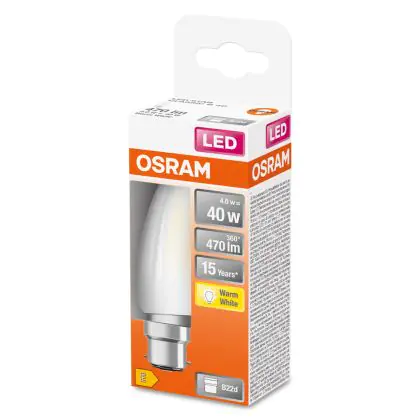 Cette ampoule Osram LED B22D Bougie Filament Dépolie 4W 470lm - 827 | Remplacement 40W avec son efficacité lumineuse de lumen par watt vous permettra de profiter d’un éclairage de qualité. Avec sa durée de vie de 15000 heures, vous n’aurez pas à vous soucier de son remplacement avant quelques années.
