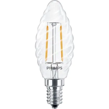 Cette ampoule Philips Corepro LED Bougie E14 Torsadée Bougie Filament Claire 2W 250lm - 827 | Remplacement 25W avec son efficacité lumineuse de lumen par watt vous permettra de profiter d’un éclairage de qualité. Avec sa durée de vie de 15000 heures, vous n’aurez pas à vous soucier de son remplacement avant quelques années.